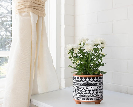Set of 2 Terracotta Planter Pots, 4 Inch & 6 Inch, Design Plants Pot with Drainage Hole, Midnight Lace, Terracotta/Black, 31-953-F-2