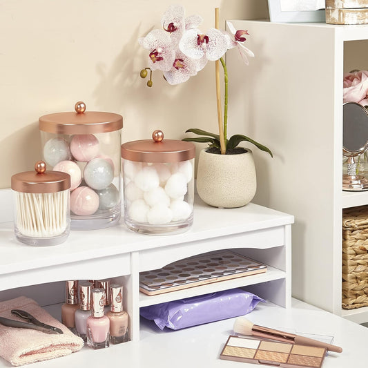 3-Pack Premium Quality Qtip and Cotton Ball Holders | 15-Oz to 60-Oz Clear Plastic Apothecary Jars with Matte Rose Gold Lids | Perfect Containers for Bathroom and Vanity