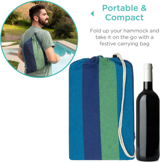 2-Person Brazilian Double Hammock Bed W/ Carrying Bag for Backyard, Patio, Indoor Outdoor Use, Cross-Woven Cotton Fabric for Comfort - Blue